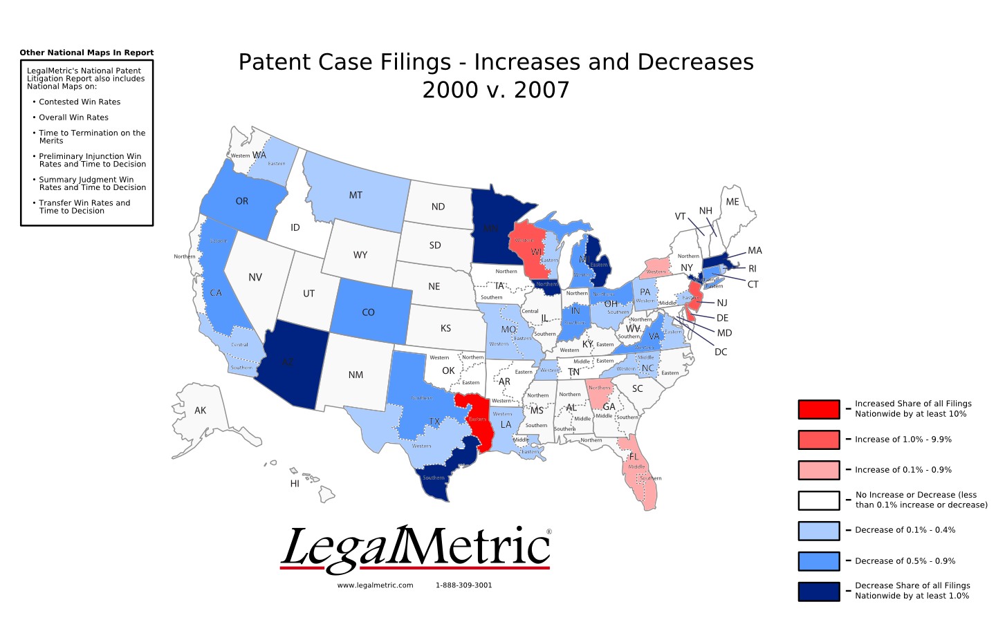 LegalMetric's Nationwide Patent Litigation Report includes comprehensive coverage of every district in the United States. This report can help you select the best district for litigation, avoid unfavorable districts, and manage client expectations with facts, not anecdotes or guesswork.