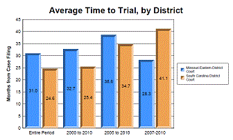 The number of trials and average time to trial, by year, are shown for all selected districts, and the cases in which the trials occurred are identified.