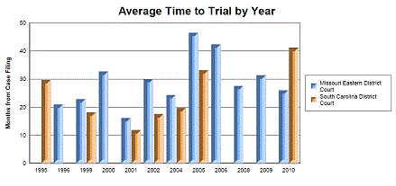 LegalMetric's Time to Trial Reports compare the time to trial for any two or more districts you select.