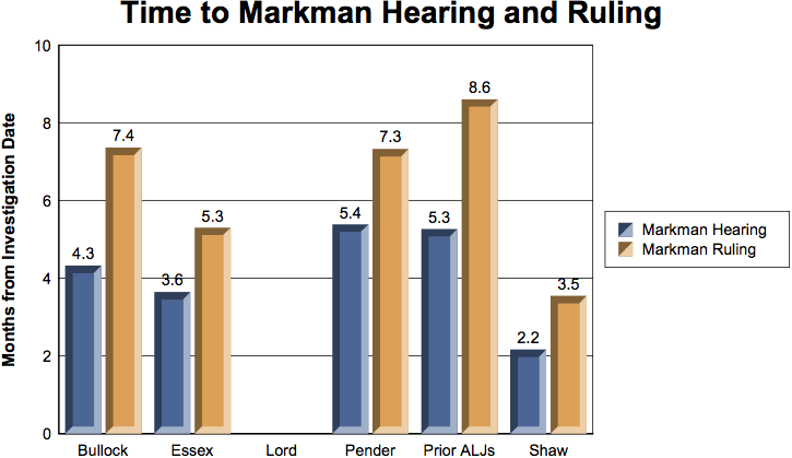 | Are there Markman hearings and rulings and if so, when do they occur? | Average Time to Markman Hearing and Markman Ruling by ALJ (if applicable) |